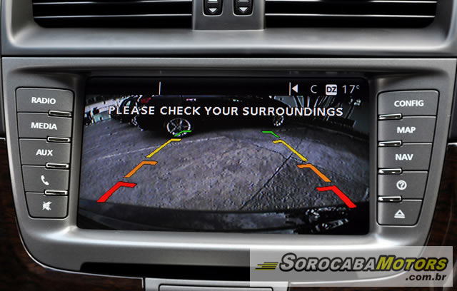 O display ainda mostra informações dos sensores de estacionamento traseiro que, por meio de imagem ou diagrama apresentado indica a presença, na esquerda, centro ou direita, de eventuais obstáculos, quando a marcha à ré é acionada.