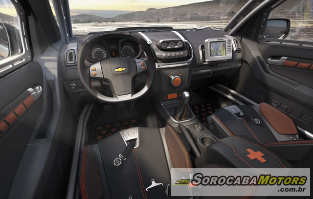 Dentro da picape, outro item que chama a atenção é a estrutura interna de proteção dos ocupantes (gaiola), que facilita o acoplamento de equipamentos extras, tais como câmeras ou iluminação auxiliar para o navegador. E por falar em pilotos e navegadores, a Colorado Rally oferece um sistema de navegação de GPS de última geração e também o Hydration Pack. São caixas isoladas termicamente que contém uma solução isotônica para hidratação dos ocupantes, que passa por uma pequena tubulação ligada aos assentos. Além destas duas caixas, a picape ainda oferece outras com ferramentas e com um kit de primeiros socorros.