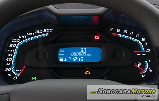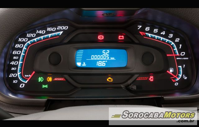 O computador de bordo, item opcional na Montana LS, integra as informações de consumo médio (km/l), consumo total (km/l), velocidade média (km/h), autonomia (km), temperatura externa (°C) e hora (relógio).