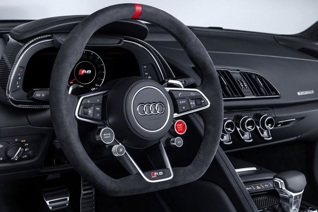 Os componentes para o interior dão o toque final à linha. Um volante de contornos esportivos com controles multifuncionais está disponível para o R8 e para o TT; revestido em Alcântara e incluindo um relógio vermelho. Alavancas de mudança de marcha feitas de CFRP estão disponíveis para os modelos equipados com o sistema S tronic de sete velocidades. A Audi Sport desenvolveu uma barra de suporte transversal especificamente para o TT – também feita de CFRP. Ela substitui os assentos traseiros, reduz o peso em cerca de 20 kg e incrementa a rigidez de torsão. A barra de suporte melhora a condução particularmente ao fazer curvas em altas velocidades.