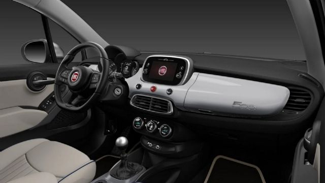 No interior, o 500X Dolce Vita Launch Edition apresenta a mesma combinação do exterior. O painel é de plástico de tom preto, enquanto que os bancos são estofados em tecido na cor branco. A cor azul se soma nas costuras, nos debruns e no bordado do nome numérico do modelo na parte superior do banco.